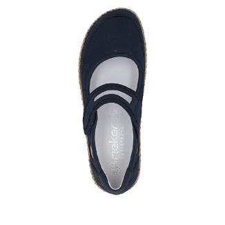 Ny modell ballerina från Rieker i marinblått med stretch material på ovansidan för ömma fötter.Ställbart kardborreband över vristen.Skön antistress sula i soft skinn mot foten.