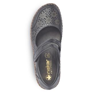 Omtyckt ballerina från Rieker i svart skinn med stansat blommönster.