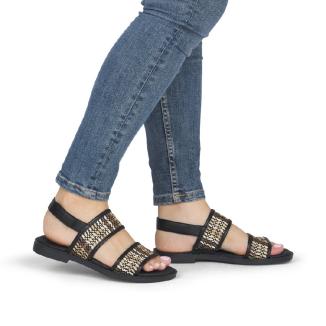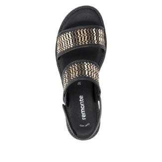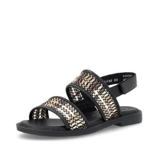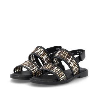 Sandal med platt gummisula från Remonte i svart skinn med mönster av beiga och bruna flätningar .Mjuk feel soft skinnsula mot foten .Kardborreband bakom hälen.