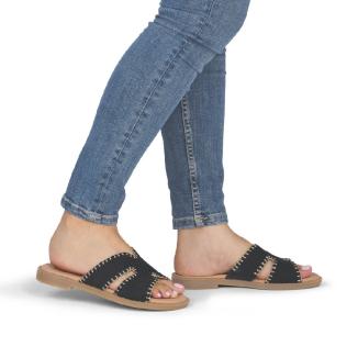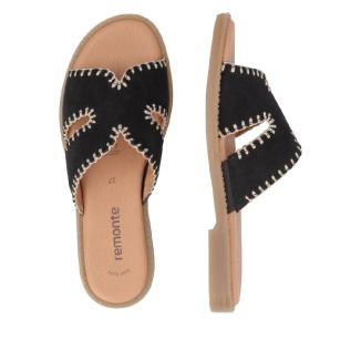 Sandal med platt gummisula från Remonte i svart nubuck med mönster av beiga stickningar .Mjuk feel soft skinnsula mot foten .