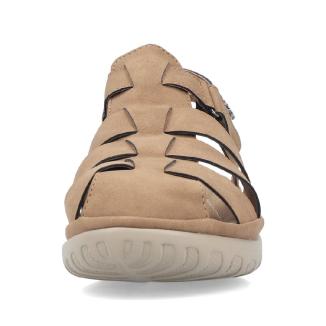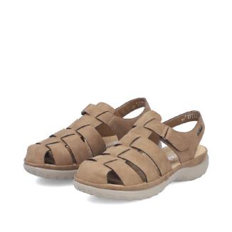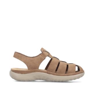 Ny modell sandal från Rieker i brunt med stängd tå och med skön dämpande sula mot foten .Kardborreknäppning på sidan.