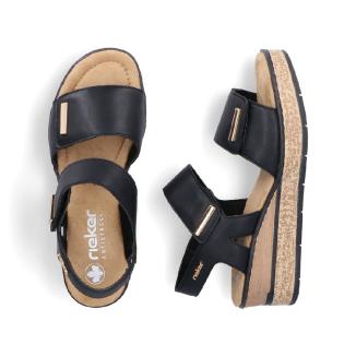 Ny modell sandalett i svart med breda kardborreband med dekorativa guldspännen och med lätt kilklacks sula dekorerad med olika lager av korkinspiration.