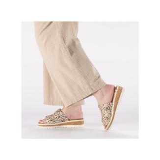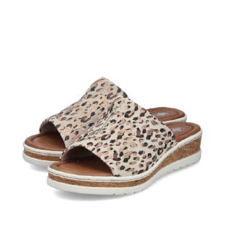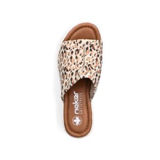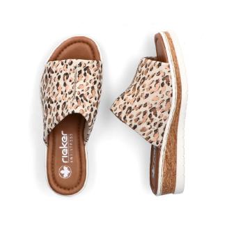 Fint slipin sandal från Rieker i beige kombinerat bruna och bronze färgat mönster på ovandelen.Lätt korkinspirerad kilklacks sula.