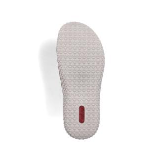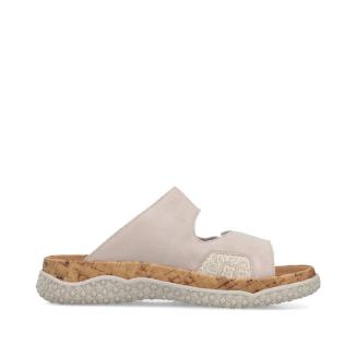 Slipin sandal från Rieker i beige mocka med partier i mjuk textil med strech. Dubbla spännen med kardborrelås. Formad antistress sula mot foten som är uttagbar. Extra bred läst