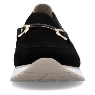 Damloafer från Rieker i svart nubuck med ett dekorativt, guldfärgat spänne framtill. Små resårer för bästa pasform.