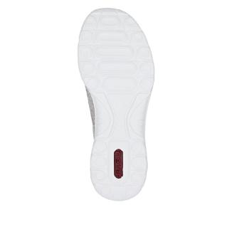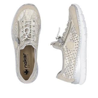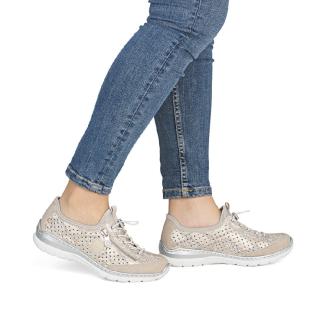 Omtyckt Riekermodell i guld/silver glittrande beige nyans perforerat luftigt material med resårsnöre för att lätt komma i .Dekorativt blixtlås på sidan och skön memosoft sula mot foten .