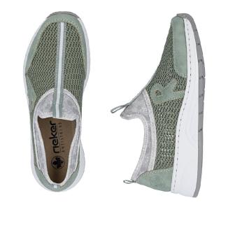 Skön sneaker från Rieker i grönt i luftigt mesh tyg och syntetiska förstärkningar vid häl och tår. Memoryfoam sula som formar sig efter foten.