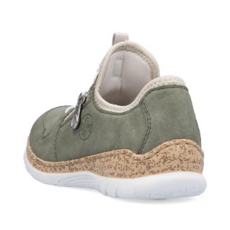 Skön damsko i grönt med elastisk snabbsnörning med stopper och skön memosoft sula mot foten. Dekorativ blixtlås på sidan.Mycket omtyckt modell från Rieker.