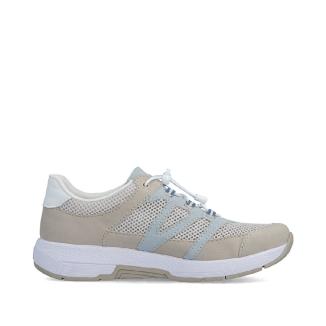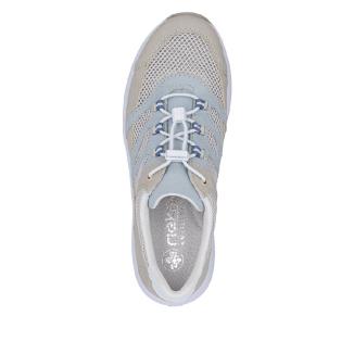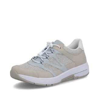 Sportig sneaker från Rieker i beige med ljusblå detaljer och luftigt nätmaterial Perfekt sko att promenera i med skön dämpande sula.