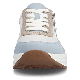 Sneaker från Rieker i beige med partier av olika material och färger i beige-ljusblå-guld-leopard. Lätt modell med uttagbar innersula för egna inlägg. Både snörning och blixtlås för bästa passform.