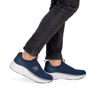 Ny modell sneaker från Rieker i blå mesh med skön dämpande sula. Perfekt både som tränings sko eller till vardags. Uttagbar innersula och bra greppsula i gummi. Slipon modell. Bred modell .