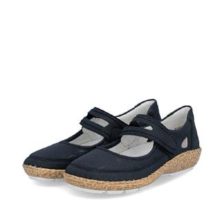 Ny modell ballerina från Rieker i marinblått med stretch material på ovansidan för ömma fötter.Ställbart kardborreband över vristen.Skön antistress sula i soft skinn mot foten.
