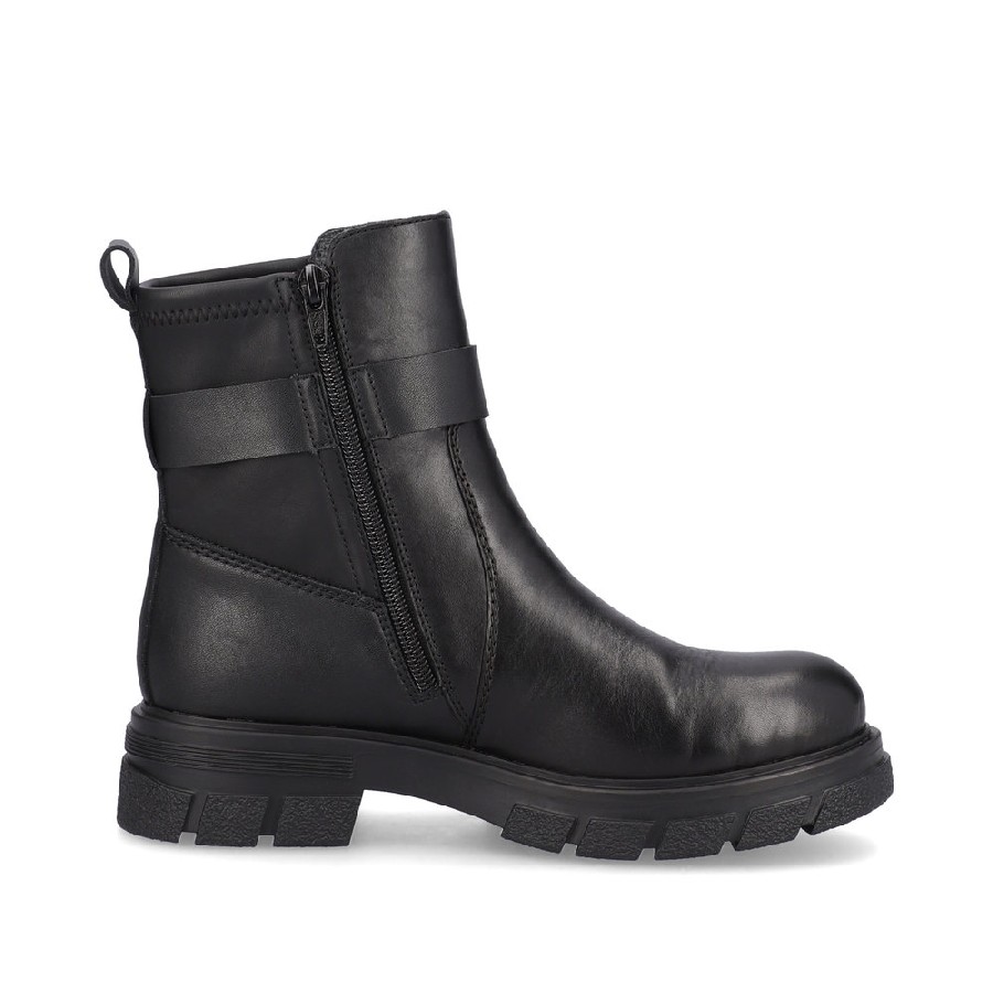 Favorit bland Rieker boots i svarta skinn.Fodrad med filt och stretchigt material i vid vristen baktill.Dekorerad med guldspänne på sidan och blixtlås på insidan för att lätt ta på.