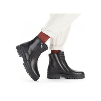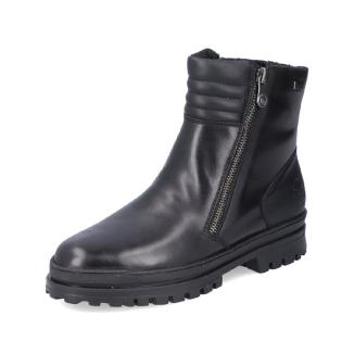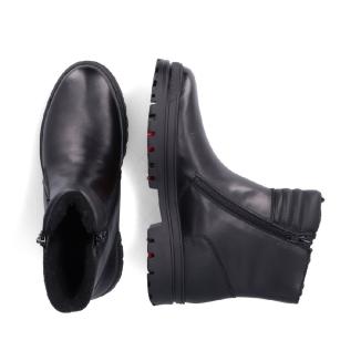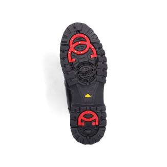 Känga från Rieker i svart skinn med blixtlås både på insidan och utsidan. Varmfodrad och med Rieker Tex membran som gör skorna vattenavvisande. Grov yttersula med utfällbara broddar.