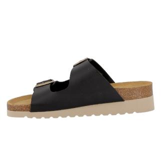 Slipin sandal Tia från Axelda i svart syntet på lätt kiklack.. Tillverkad med skinnklädd sula, fotbädden gjord med latexmaterial i kärnan vilket ger en extra stötdämpande effekt! Extra kudde i fotbädden motverkar hälsporre. Sula i Eva. Ovandel av syntetmaterial klädd med skön textil invändigt och två ställbara remmar för bästa passform .