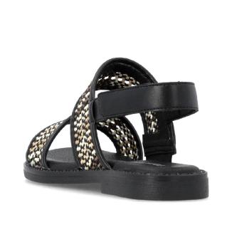 Sandal med platt gummisula från Remonte i svart skinn med mönster av beiga och bruna flätningar .Mjuk feel soft skinnsula mot foten .Kardborreband bakom hälen.
