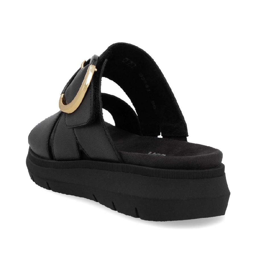 Denna stiliga sandal från varumärket Remonte erbjuder både komfort och elegans. I mjukt svart skinn och guldfinish på spännet, är den perfekt för både vardag och fest.