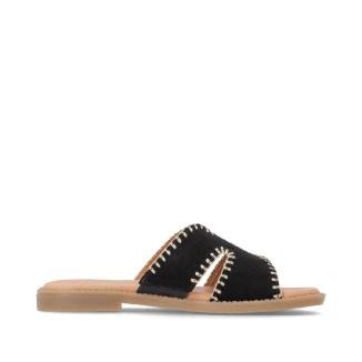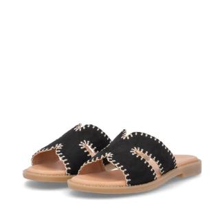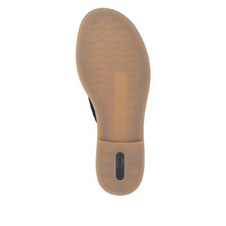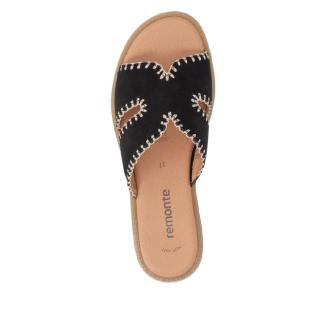 Sandal med platt gummisula från Remonte i svart nubuck med mönster av beiga stickningar .Mjuk feel soft skinnsula mot foten .