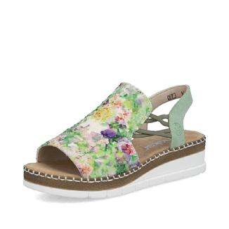 Sandalett från Rieker i grönt med blommigt mönster. Resår på sidorna för att lätt komma i och med en lite mindre kilklack på ca 4,5 cm.