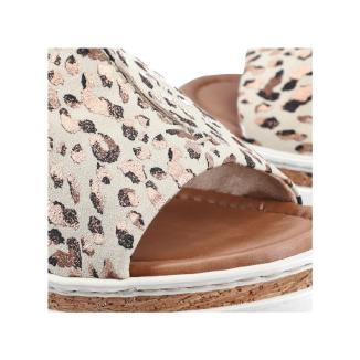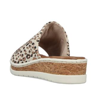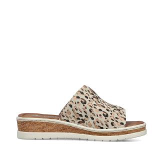 Fint slipin sandal från Rieker i beige kombinerat bruna och bronze färgat mönster på ovandelen.Lätt korkinspirerad kilklacks sula.