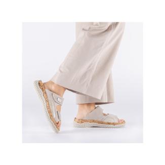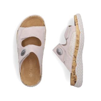 Slipin sandal från Rieker i beige mocka med partier i mjuk textil med strech. Dubbla spännen med kardborrelås. Formad antistress sula mot foten som är uttagbar. Extra bred läst