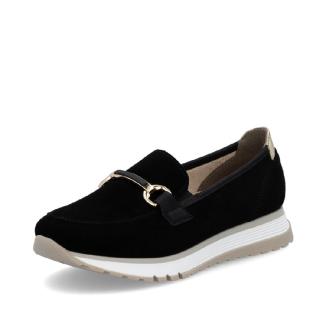 Damloafer från Rieker i svart nubuck med ett dekorativt, guldfärgat spänne framtill. Små resårer för bästa pasform.