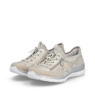 Omtyckt Riekermodell i guld/silver glittrande beige nyans perforerat luftigt material med resårsnöre för att lätt komma i .Dekorativt blixtlås på sidan och skön memosoft sula mot foten .