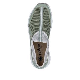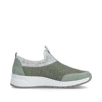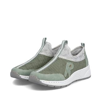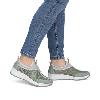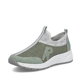 Skön sneaker från Rieker i grönt i luftigt mesh tyg och syntetiska förstärkningar vid häl och tår. Memoryfoam sula som formar sig efter foten.