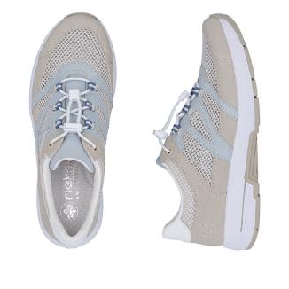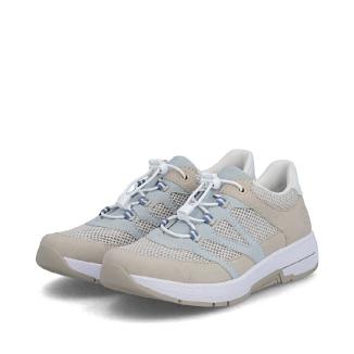 Sportig sneaker från Rieker i beige med ljusblå detaljer och luftigt nätmaterial Perfekt sko att promenera i med skön dämpande sula.