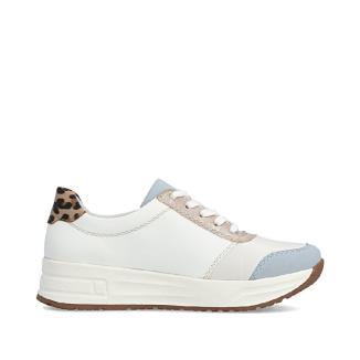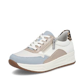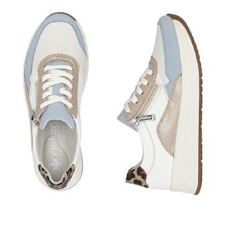 Sneaker från Rieker i beige med partier av olika material och färger i beige-ljusblå-guld-leopard. Lätt modell med uttagbar innersula för egna inlägg. Både snörning och blixtlås för bästa passform.
