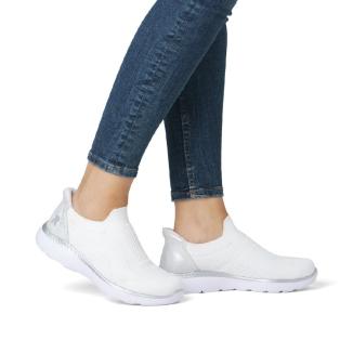 Ny modell slipin, Ready To Go, sneaker från Rieker i vitt som du bara kliver i. Lätt modell med stretch material. Skön dämpande memosoft sula mot foten samt dämpande yttersula i gummiblandning.