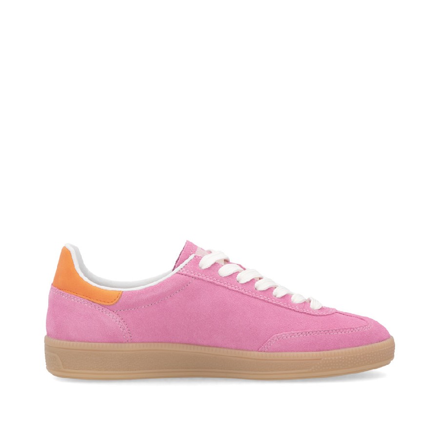 Skön sneaker från Rieker sport & style i rosa mocka med oranga inslag. Snörning och bra greppsula i gummi. Lätt modell.
